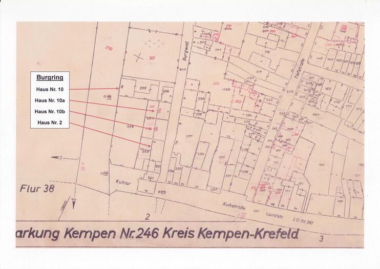 Häuser Burgring Nr. 2, 10, 10a und 10b auf einer Flurkarte - Neukartierung von 1911 und 1932-37 sowie Fortschreibungen bis 1953 -
