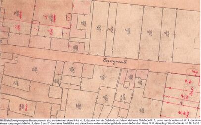 Das Haus ist das leicht in den Burgwall vorspringende Gebäude in der rechten unteren Hälfte.