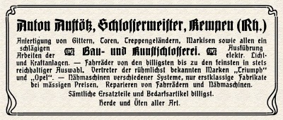 • Anstötz, Anton, Kunst- u. Bauschlosserei, Eisenwarenhdlg., Fahrräder, Nähmaschinen, Herde, Tel. 134