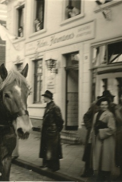 Hermann Spoeskes Tochter Gertrud (Traudchen) heiratete 1922 den jungen Bäckermeister Heinrich Hermans (links im Bild mit Sohn Karl-Heinz etwa 1944), und aus der Bäckerei Spöskes wurde die bekannte Bäckerei Hermans. [2][3] Der Eintrag "Hamens, Heinr., Bäcker und Wirt" im Adressbuch von 1925 dürfte wohl falsch sein.