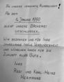 1958 heiratete er seine Frau Resi, geb. Neeten, von der Vorster Straße 1, *6.6.1934; gest. 15.4.2023) und übernahm mit ihr den elterlichen Betrieb. Die Gastwirtschaft hat er nur noch wenige Jahre fortgeführt.[3] Noch bis zum 31.12.1989 (siehe Zettel in der Bildergalerie unten), drei Monate nach seiner Wahl zum Kempener Bürgermeister, führte Karl-Heinz Hermans die Bäckerei und belieferte die Bürger Kempens mit Backwaren aller Art. Seine Frau Resi sorgte im Laden für den Verkauf. Als Spezialität des Hauses galt der köstliche Bienenstich, den Karl Heinz nach dem Rezept seines Vaters backte. Ebenso sind die leckeren Plätzchen, z.B. „Spekulatius" oder kleine „Schweineöhrchen" mit Zuckerguss zu erwähnen, mit denen der alte Bäckermeister auch heute noch ab und zu Bekannte und Freunde überrascht.[4] Die Qualität seiner Brötchen ist bis heute in Kempen unerreicht.