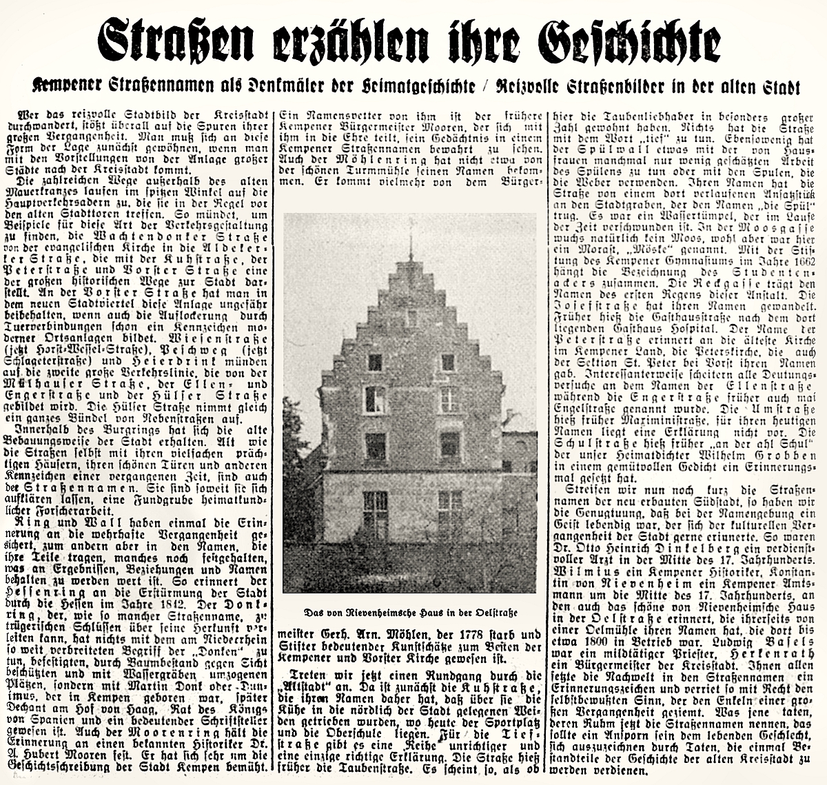 2. Straßen erzählen ihre Geschichte, Kempener Straßennamen als Denkmäler der Heimatgeschichte / Reizvolle Straßenbilder in der alten Stadt, in einer Ausgabe der Volksparole in der NS-Zeit