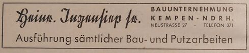 Nach einer Anzeige im Heimatbuch des Kreises Kempen-Krefeld von 1953 war hier der Sitz der Bauunternehmung Heinrich Ingensiep.