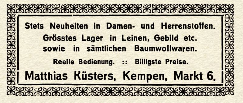 - (Herunterladen) 1912 Annonce Küsters Stoffe Markt 6.jpg . . 800 × 338 . . 70 KB . . Mutzii . . 00:13, 9. Jul. 2014