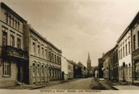 Die Häuser Vorster Str. 10, 12 und 14 hatten wahrscheinlich vor der Neu-Nummerierung der Vorster Straße die gemeinsame Hausnummer 26. Das alte Gebäude mit der schönen Stuckfassade wurde um 1890 erbaut und gehörte um die Jahrhundertwende zur Sauerkrautfabrik ''Heinrich Spelter & Cie.''<ref>Einwohneradressbuch von 1898</ref> Diese wurde dann wohl verkauft und firmierte schon ein paar Jahre später unter ''Steves & Cie., Heinr., Vorster Str. 26''.<ref>Adressbücher von 1912 bis 1937</ref> Der Eintrag erscheint im Branchenteil unter der Rubrik ''Sauerkrautfabriken''. Im alphabetischen Teil gibt es 1925 noch weitere Informationen: Inhaber des Unternehmens waren danach "Wilhelm Reutz und Jos. Steves in Schmalbroich u. Joh. Gehr in Vorst", und die Firma Steves hatte die beeindruckende Telefonnummer 2. | Die Häuser Vorster Str. 10, 12 und 14 hatten wahrscheinlich vor der Neu-Nummerierung der Vorster Straße die gemeinsame Hausnummer 26. Das alte Gebäude mit der schönen Stuckfassade wurde um 1890 erbaut und gehörte um die Jahrhundertwende zur Sauerkrautfabrik ''Heinrich Spelter & Cie.''<ref>Einwohneradressbuch von 1898</ref> Diese wurde dann wohl verkauft und firmierte schon ein paar Jahre später unter ''Steves & Cie., Heinr., Vorster Str. 26''.<ref>Adressbücher von 1912 bis 1937</ref> Der Eintrag erscheint im Branchenteil unter der Rubrik ''Sauerkrautfabriken''. Im alphabetischen Teil gibt es 1925 noch weitere Informationen: Inhaber des Unternehmens waren danach "Wilhelm Reutz und Jos. Steves in Schmalbroich u. Joh. Gehr in Vorst", und die Firma Steves hatte die beeindruckende Telefonnummer 2. | ||