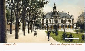 Auf dem nebenstehenden Bild und auch auf den Bildern in der unten stehenden Bildergalerie wird deutlich, dass die Thomasstraße einst eine prachtvolle Allee war, die vom Bahnhof aus in die Stadt bis zum Franziskanerkloster führte. Auf den Bildern ist auch erkennbar, warum die Straße auf beiden Seiten des Ringes noch heute den gleichen Namen hat. Denn früher wurde sie kaum durch den Ring bzw. die umlaufende Promenade unterbrochen. Auf der nördlichen Seite war das Burggelände. Auf den nebenstehenden BIldern ist eine Einmündung zum heutigen Burgring kaum erkennbar. Auch auf der Postkarte "Burgring mit Postamt" wird deutlich, dass es den Burgring in der heutigen Form nicht gab. Er ähnelt hier eher einem Weg in einem Park rund um die Burg.