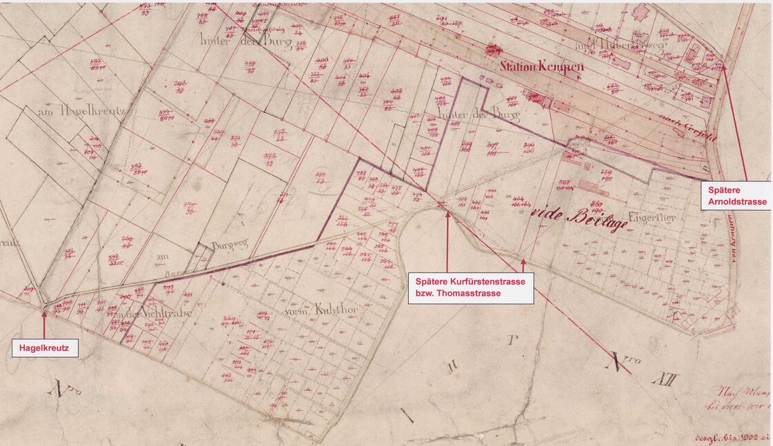 Die heutige Burggasse verläuft von der Thomasstraße zur Kurfürstenstraße und ist der letzte noch vorhandene bzw. begeh- und befahrbare Teil des ehemaligen Burgweges. Dieser war bis Mitte des 19. Jahrhunderts die einzige direkte Verbindung zwischen den beiden Hauptstraßen nach Aldekerk bzw. St. Hubert außerhalb der Stadtmauer bzw. der alten Befestigungsgräben.