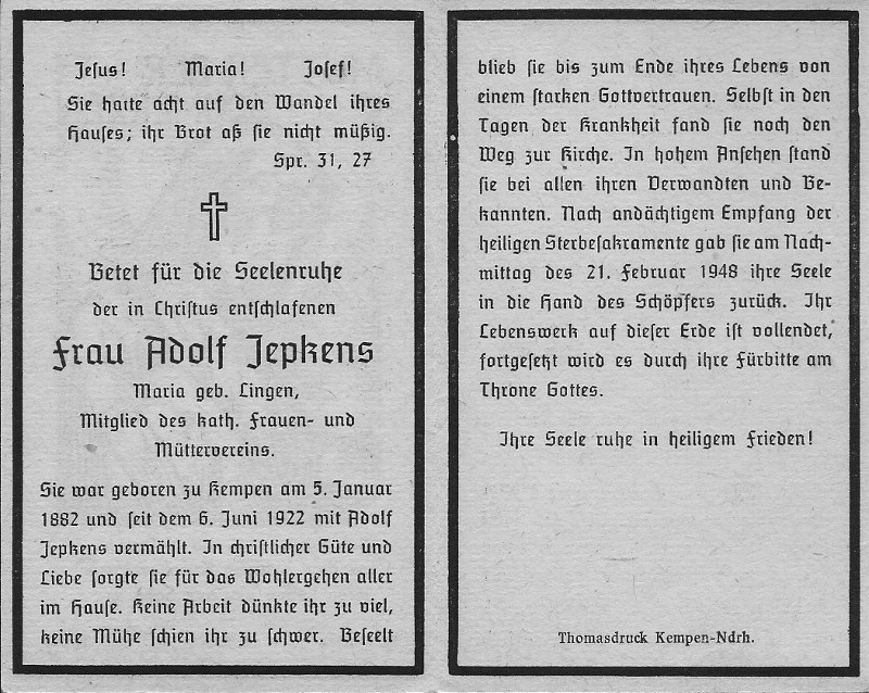| 16:11, 25. Mär. 2019 | Totenzettel Josefine Peerbooms geb Recken.jpg (Datei) | 184 KB | Datei hochgeladen mit MsUpload | 1 | |
