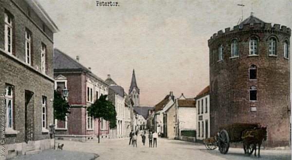 Blick in die Peterstraße von der Vorsterstraße aus: links das Haus mit dem jetzigen Café Amberg, früher Fahrradgeschäft Julius Hüren (Hüren-Tobrock). Die Gärtnerei Thiemann hat in der Peterstraße 22 (rechts) ihr Domizil einschließlich des historischen Peterturmes.