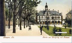 Eine ganz typische Erscheinung für das Entstehen einer solchen Bahnhofs-Siedlung außerhalb der Stadt, wie man sie im 19. Jahrhundert auch an vielen  anderen Orten beobachten konnte, war die Anlage bestimmter Institutionen in der Nähe oder auf dem Wege von der Stadt zum Bahnhof. In Kempen siedelte sich die neue Poststation ganz bewußt an dieser Verkehrsachse an. Die  Post in Kempen war im Laufe des Jahrhunderts mehrfach umbenannt und quasi befördert worden, so 1871 in eine Postanstalt III. Klasse, dann 1876 in ein Postamt II. Klasse; 1871 war auch eine „Kaiserliche Reichstelegraphenstation“ eingerichtet worden. Die Unterkunft in einem Haus an der Südseite des Marktes (heute Optiker Palm (Anm. bzw. Rottler)) war aber zu klein, so daß man zur Planung eines Neubaus an der Ecke Moorenring/Thomasstraße schritt. Im Frühjahr 1899 konnte das repräsentative Gebäude bezogen werden, das später der Stadtsanierung zum Opfer fiel. Die Verbesserung der Verkehrsverbindungen, die Konjunktur der Gründerzeit, eine liberale Wirtschaftspolitik, all dies bescherte der Stadt in den 70er  Jahren des vergangenen Jahrhunderts einen starken Aufschwung. Im  Gelände um den Bahnhof entwickelte sich eine rege Bautätigkeit, so entstanden Haus Horten oder der Bau des Notars Schüller, nachdem auf der Außen-  Seite der Gräben die alten Scheunen und Schuppen abgerissen waren und  durch die Trockenlegung des Stadtgrabens der Wohnwert der Außenseite  der Ringe wesentlich erhöht worden war.