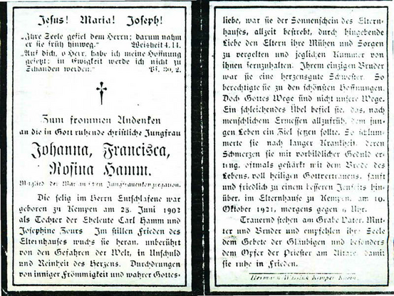 Karl Hamm ist geboren am 17. August 1860 und verstorben am 19. November 1931. Er war verheiratet mit Josephine Zours (*2.8.1873, †5.4.1950). Aus der Ehe stammten die Kinder Josef (*29.4.1901, †27.5.1958, verh. mit Anna Wefers) und Johanna (Johanna Francisca Rosina, *23.6.1902, †10.10.1921). Sie wurde nur 19 Jahre alt.