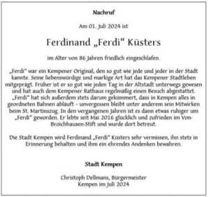 mini|Nachruf des Bürgermeisters auf Ferdinand "Ferdi" Küsters